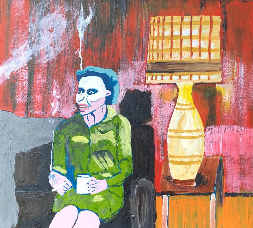 for five years I’d been painting an investigation into the complexities of being a human being; the shadow self, identity, personas and personality disorders and, the nature of relationships and how we treat one another. particularly how adults treat children; what parents do. existential matters.. I’d worked on a few other related subjects but this was the bulk of what I was working on. I painted every day. though the subject matter of what I was exploring was coming from complex and dark origins the paintings were practically always executed in bright and often garish colours; pinks reds aqua and sky blues yellows and hospital greens, for whatever reason I selected to paint these unsettling scenarios playfully. Suggesting a sense of the absurd perhaps.. During this phase I used characters; other people; figurative set ups to convey what I was feeling and investigating. Somehow I didn’t wish to display too much personal involvement in the work. These situations therefore were showing the potential condition of any or every man or woman. Though I was channelling my own very personal experience and interpretation of these feelings and conditions I preferred to maintain a certain anonymity in the execution of the imagery. Then I started TM.